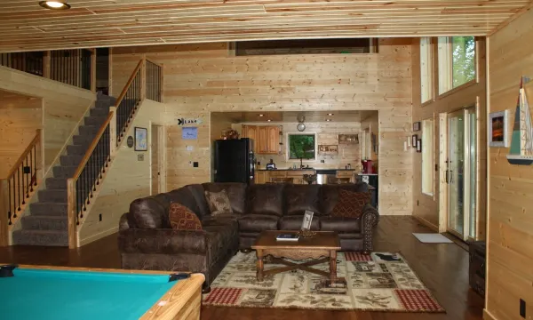 Step into a spacious, light-filled home with panoramic lake views from nearly every room. The main level boasts a cozy yet expansive family room with a wall of windows that frame the water like a painting. Challenge someone to a game of pool, or enjoy a family movie night on the Smart TV. Central air and high-speed Wi-Fi ensure comfort and connection throughout your stay.