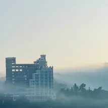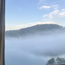 飯店有分2館,原本訂的是一館,後升級到二館的湖景房,視野超棒,房間也大,清晨六點起床,走過了馬路就可以到湖岸的步道,從這裡走到朝霧碼頭,可以看見清晨的飯店被雲霧繚繞,拍起來的照片真的美翻了😊