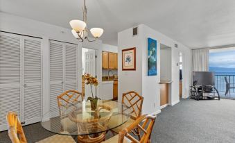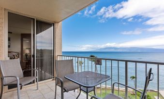 Our fully air conditioned condo unit 607 is beautifully appointed with island decor throughout. From the moment you step in the door you will be greeted by a breathtaking view of the ocean and gardens and Molokai Island to the right. As you proceed to our lanai with seating for four, you may be greeted by sail boats passing by and surfers just off shore.  A short walk to the shoreline at the edge of the property and you can often see green sea turtles as they feed on coral in the surf. You'll enjoy free wifi throughout the condo and flat screen cable tv in the bedroom and the living room. Our full kitchen is well stocked with service for 4 and a washer/dryer is provided in the unit. The dining table seats 4. The master suite is large with a comfortable king bed w/luxury linens and a flat panel TV/DVD player. Free wireless internet (WIFI) is available within the unit.  The bathroom includes a tiles walk-in shower with luxury linens. The couch in the living room folds out to a queen bed, so the condo sleeps four comfortably and a flat screen TV with DVD player and wireless connection to Netflix and other online services. A slider gives you access to the lanai from the living area, and master bedroom.  This provides breathtaking and seemingly private garden, ocean and mountain views. The Royal Kahana property boasts a spacious pool area with a large heated pool; an impeccably maintained lawn area with lounge furniture for sunbathing; a large indoor cabana for dining and entertainment; several gas barbecues, ping pong tables, and shuffleboard. There is an exercise room with treadmills, weight machines, and stair-stepper.  Parking is available outside or in the underground garage. The Royal Kahana resort charges $18 per day for parking.