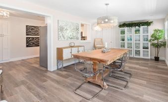Moving inside, the modern coastal-style dining room is the perfect place to enjoy a meal cooked using our fully stocked kitchen. The home is near several grocers, including Publix, Fresh Market, and Whole Foods.