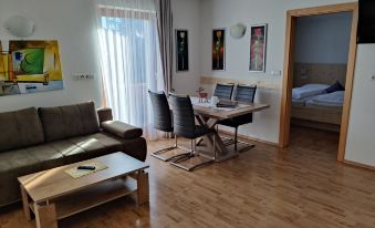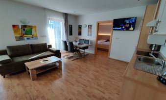 The self-catering apartments in Alpine style come with a balcony with mountain views, wooden floors, and a living area with a fully equipped kitchenette. Linen and towels are included.