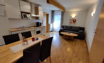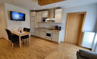 The self-catering apartments in Alpine style come with a balcony with mountain views, wooden floors, and a living area with a fully equipped kitchenette. Linen and towels are included.