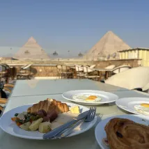 屋頂的景色非常好。以金字塔和獅身人面像為背景拍照,景色很棒。早上的麥片盒也很棒。