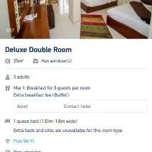 非常差的體驗 房間旁邊就是酒吧 要吵到半夜 早上6點又開始吵 實在睡的不好 更離譜的是 提前一天退房 酒店同意 可是攜程説聯繫不上酒店及當地代理 四天了 房費一直沒退!攜程客服多次聯繫我 每次換個人 説著一樣的話 就是解決不了問題!建議境外酒店儘量不要通過攜程定 服務能力很差