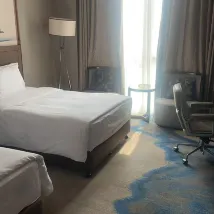 環境不錯,寬敞明亮,採光好,設施設備齊全,有健身房,游泳池乾淨衞生,外賣可機器人送到房間。逛街購物停車出行都很方便。前面是萬達,後面是公園。前台服務好,很熱情。總之不錯哦,下次還來!