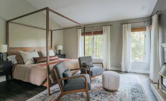 - A master suite with a beautiful canopy King bed with great wooded views and seasonal views on one of the adjoining twin ponds, a lounge area to enjoy your morning coffee (note the fireplace is for display only), a work desk, and a master bathroom with stunning tilework on the glass shower enclosure and 2-person tub