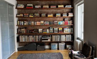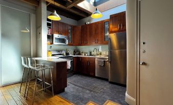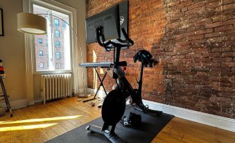 15 foot beam ceilings, exposed brick walls, wood burning fireplace, large bright bedroom with Swedish Hastens bed. Spacious, windowed bathroom with Jacuzzi tub and stacked washer/dryer, chef's kitchen with skylight (plus wine fridge and in-sink garbage disposal), Peloton bicycle, projector TV, windows facing east and west, and... your own private 1100 sf roof deck!