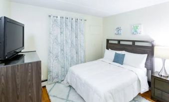 The larger of the 2 bedrooms features a comfortable queen-sized bed, a TV equipped for streaming services, a large closet, a chest with plenty of draw space, a bedside lamp with USB port, a chair, a mirror on the back of the door and a portable full-length mirror in the closet and natural lighting.