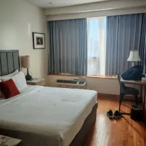 房間不大,約12平。床1.3米。挺乾淨的。出行方便。早餐有粥和包子,饅頭。前台可以約中文司機送肯尼迪機場,價錢也不貴。35-40美元。