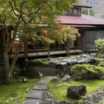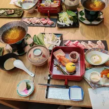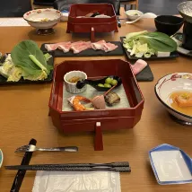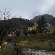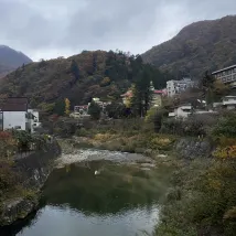 位置較遠,很少火車經過此站。村莊本身很小,但很美麗,尤其是在秋天——所有的山脈都美麗地覆蓋著不同顏色的樹葉。 飯店很大,很漂亮,很整潔。工作人員很有禮貌,其中一名員工會說英語,還有許多外國遊客。懷石料理晚餐和早餐都很棒——一切都很美味,員工解釋了吃什麼以及如何吃。溫泉很乾淨而且很熱。