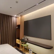 房間一進來我非常驚訝,無論環境和設施都非常好,全屋智能,大屏投影儀、電動床、智能化燈光、電動窗簾等都是無法想象的,進來後窗簾會自動關閉保護個人私隱,語音控制燈光、窗簾和空調都想象不到是一晚兩百多塊錢的酒店能體驗到的,非常值得體驗。