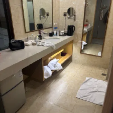 房間不小。房內設施都還不錯,浴室裏的洗頭液和洗澡液的瓶子不太容易往外擠,我衹好把頭部擰下來倒出液體,可能我使用不當吧。環境還是比較乾淨的。被子覺得稍微有點濕氣,可能天氣熱,沒開空調的時候濕氣容易激起來吧。早飯內容也還豐富,如果豆漿的濃度大幅度增加,就比較好。早餐不包含咖啡,有點令人失望。我有兩張餐劵,但就我一個人用餐,問服務員是否可以用一張餐劵換一杯咖啡,被服務員和廚師給拒了。用機器壓出來的麪條,有點創新精神。可是口感可能人工的會更加筋道一點吧。地點非常方便,就在高鐵站邊上。最後,雖然現在一般在房內不放一次性洗漱用品,但前台還是給發了。實際上可以問一下客人是否有需要,或者不主動發,也不主動問,讓客人有需要的時候來要。總體來説,是個性價比比較高的酒店。