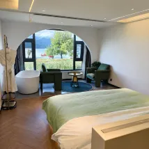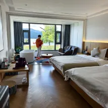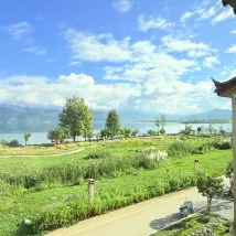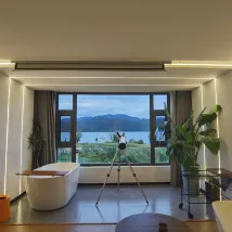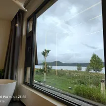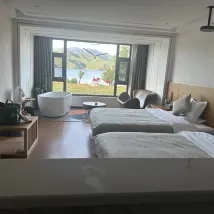 環境:花園設計風格清新別緻,大廳優雅舒適,乾淨衞生。房間設計時尚簡約大氣優雅舒適👍超大落地玻璃,大浴缸,獨立廁所,獨立洗澡間,超長寬敞洗漱台,冷熱水切換順暢,舒適搖搖椅,自動化窗簾紗簾,窗外就是無敵大湖景。出門左邊看日落,出門右邊看日出,右邊50米就是乘船遊湖的碼頭、停車場、小電驢停放點。酒店後面幾百米就有很多飯店選擇,老闆推薦的飯店也不錯👍。營養早餐:湯麪🍜包子、番薯🍠、橙子🍊、雞蛋🥚。服務:我們沒有自駕車,老闆貼心的接我們回酒店,又送我們去乘車點,出去上下樓梯都幫忙搬行李。每次進進出出老闆都熱情打招呼,還提供很多實用的建議、注意事項等!教我們合理安排行程。還有地方洗晾曬衣服。原本訂的房間套餐衹包括兩份早餐,因為我們還有孩子,所以老闆好心送了一份早餐給孩子。雖然我們衹住一天,但是老闆全程都很細緻的照顧!