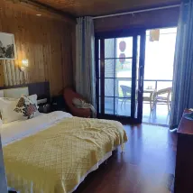 酒店在瀘沽湖大落水村,訂的三樓面湖大床房,有陽台,配茶几和搖椅,視野開闊,環境非常好。酒店前台服務熱心,幫客人拿行李。