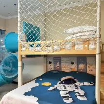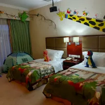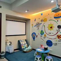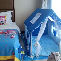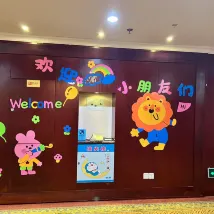 很好奇酒店的親子主題房是什麼樣的,在前台補差價升級了一間。前台小胡服務態度很好,帶我們看了好幾個主題的房間,有叮噹貓的,超級飛俠的,還有**熊的,最後我們選擇了這一間森林主題 的,房間佈置很有氛圍感,而且還是帶有投影儀,非常不錯,值得推薦!