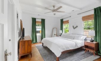 We invite you to make yourself at home! Our property consists of a 1940s craftsmen bungalow and two one-bedroom apartments adjoined by an outdoor courtyard. The open living area of the historic main house has everything your group will need to gather, cook, and dine together, or you could choose to use the gas grill and dine al fresco in the courtyard. Guests of all ages and their furry friends will enjoy the recreational activities available in the fully fenced outdoor space - the putting green, bocce court, cornhole, frisbee golf, and the gas fire pit. For those who prefer to be inside, the game room in the downstairs apartment won’t disappoint.