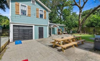 充滿活力的室外庭院 - 院子完全用柵欄圍起來並私密,圍繞著一個帶燃氣燒烤爐和 2 張野餐桌的混凝土露台。此外,飯店還設有果嶺、地擲球場、玉米洞、飛盤高爾夫和帶火坑的休息區。您還可以選擇在前廊欣賞歷史街區和參天大樹。
