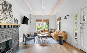 兩個寬敞明亮的起居區 - 主屋的開放式佈局包括一個帶大型皮革組合沙發和 Roku 電視的休息區、一個辦公區、一個開放式用餐區和一個美食廚房。第二個起居區位於樓上的公寓,是一個可以欣賞樹梢美景的舒適空間。它還包含一個休息區、一個工作站、一個用餐區和一個廚房。