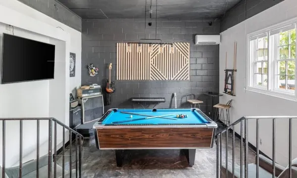 A Music-Themed Game Room – The sunken living room of the downstairs apartment has been converted into a fun hang out space with a pool table, large TV, musical instruments, stereo system, a bar cart, a dart board, and a dance floor.