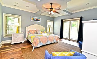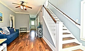 The kitchen is connected right to the living room and has plenty of room for mingling. Sip your morning coffee or catch the afternoon breeze with the hustle and bustle of town being the perfect distance away. There are 3 huge balconies on the house (2 in front, 1 overlooking the pool), so there`s lots of space for all times of day. Outdoor ceiling fans throughout and a great coastal vibe add to the experience!