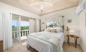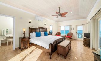 Each fully air-conditioned home has 2 master-bedroom suites. The Main home has a large King suite and a stunning ocean view with a balcony named "Azure" at one end accompanying a Library breezeway perfect for reading or just a quiet space to relax. The other end is "Palms", a Queen suite connected to the loggia adding to another ocean view.