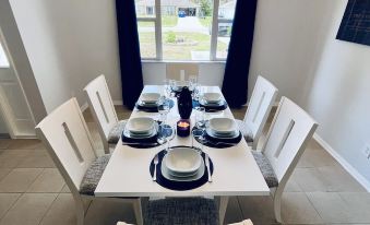 Dinning room has a beautiful white table and 6 chairs. The table does open up to be able to accommodate up to 8 people!