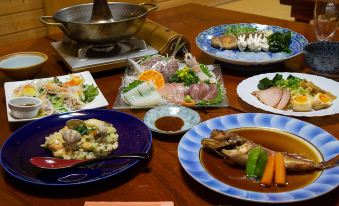 料理への拘りが強く、そして満腹にさせたい気持ちも強く、食事目的の旅としては満足度高いと思う。魚介類の料理にプラスされるリゾットやらの洋食は華やかだし驚いたが、食べきれず残した。朝食もすごかった。手作りのフレッシュジュースやコーヒーまでも美味しかった。 夕食時の飲み物注文はほぼ強制で、ビールは大瓶。 近くの浴場を利用するのも無料チケット渡すからとほぼ強制、宿のは使用不可。ただそれは宿情報から事前に予測できることなので、それ踏まえて予約したので問題なし。行き方まで丁寧に教えるというよりほぼ強制(笑)でもわざわざ出てきて教える、見送る、世話好きであり、人好きなのだとも思う。意に背くと途端に不快顔なので気を使う。 …よほどコミニュケーション力のある温厚な人しか連れて行けない。 自信満々すぎる傲慢ともいえる接客を許容できれば、民宿とは思えない品数の料理や、質の良い部屋でのひと時を楽しめるはず。 私はもう、気疲れるから遠慮する。