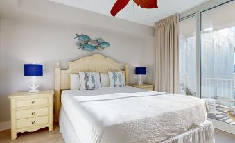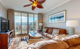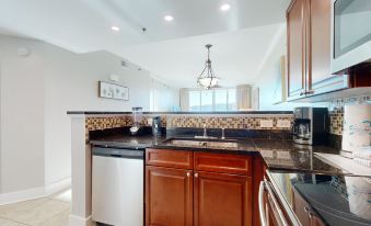 This beautiful home has a wonderful view of Waterscape's tropical garden and oasis and a partial view of the Gulf of Mexico. The primary bedroom and living room open up to a spacious balcony with a bar height glasnost table and chairs. The condo's kitchen is well appointed with granite countertops, stainless steel appliances, and beautifully tiled floors. All dishes, cooking utensils, and bake ware are provided to complete and serve meals. The square slate top dining room table has seating for four people. This lovely home offers a twin bunk area, full bath with a stand-up shower, and a washer/dryer off of the kitchen. The open living room is decorated with comfortable seating and houses a queen sofa bed, TV, and DVD player. The primary bedroom features a king bed, private bath with full-size tub/shower, TV, DVD player, and walk-in closet.