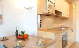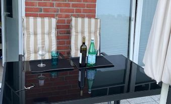 From the living room as well as from the bedroom you have direct access to the garden terrace, which is partially covered, with an unobstructed view of the lagoon / Baltic Sea. The town center is only 900m away. The terrace is furnished as new. The kitchen-living room has a microwave and dishwasher, the living area with sofa / sofa bed with satellite TV, DVD player and stereo system ensures relaxing evenings.