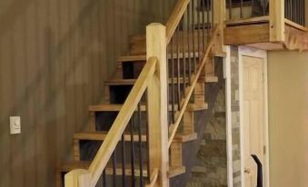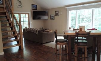 Warm and welcoming house surrounded by acres of trees. Back yard firepit is the perfect place to relax and unwind. bedroom has a queen size bed and dresser while the second bedroom is a loft space with 2 full size beds.