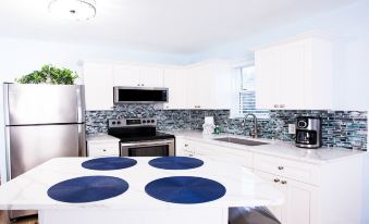 The full kitchen is equipped with all the appliances and cookware you need to prepare delicious meals during your stay. You'll find a stove, oven, refrigerator, microwave, and coffee maker, making it easy to whip up a quick breakfast or a romantic dinner for two.