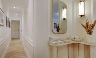 This magnificent flat offers a spacious and harmonious living environment, meticulously designed to reflect the charm of Parisian elegance. The bright and airy living room opens up to a fully-equipped open-plan kitchen, where noble materials and modern design meet functionality. The kitchen is perfect for both culinary endeavors and entertaining. Adjacent to the kitchen, the cozy living area features a comfortable sofa and a connected TV, making it an ideal spot for relaxation. The dining area, with a sophisticated table seating five, provides a perfect setting for shared meals. The modern décor and elegant furnishings throughout the flat combine seamlessly with the classic Parisian charm of the Opéra district.