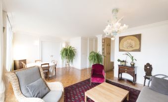 這間三居室公寓靠近塞納河畔、特羅卡德羅廣場和艾菲爾鐵塔。最多可容納 6 位顧客入住。這間公寓位於 6 樓,鋪有鑲木地板,設有直達入口的電梯。 起居室和用餐區 這個引人注目的起居區配有華麗的枝形吊燈和配套鏡子。有一個大書櫃,左側牆壁上擺放著小飾品和裝飾品。中間還有一張灰色沙發、兩張扶手椅和一張咖啡桌。蕨類植物和各種相框裝飾著整個房間。法式門也通向陽台。房間右側是用餐區,配有一張桌椅,可供 6 位顧客就座。還有一張邊桌。雙扇門通向臥室。 第一間臥室 這間臥室氛圍平靜,配有一張雙人床、床頭櫃、牆上的藝術品、室內植物和一個帶鏡子的衣櫃。陽台 陽台俯瞰周邊地區,配有桌椅供您在戶外休息放鬆。 廚房 這間明亮的白色廚房位於房間中央,配有餐桌和椅子。