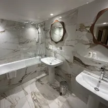 酒店在巴黎第六區,就在盧森堡公園的旁邊,離幾個地鐵站也衹有7.8分鐘的距離。酒店門口是劇院,周邊有酒吧和一些越南菜和法餐。訂的是家庭套房,一張大床和兩張1米的單人床,窗户打開就是盧森堡公園旁邊的一條小街道,夜晚總體比較安靜。雙台盆洗臉池和浴缸。裝修風格還是挺喜歡的。