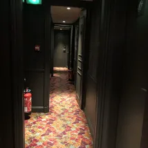 16平米的房間,不知道設計師怎麼想的,要塞下這麼多東西:一個獨立馬桶間,一個淋浴房、一個巨大的洗臉盆,一個大型浴巾架、一張寫字枱,兩把椅子,一個小冰箱、一個大型暖氣片(盒)、兩個衣櫃,一個1.8米大床、兩個牀頭櫃、一個凳子。 剩下可供走路的空間,目測不超過3平米—-進屋衹能有一個人走動,另一個必須躺床上。 對了,這層的層高可能衹有2.1米左右。伸手可以摸到屋頂。 就上面這樣的房間,還是多花錢“升級”來的。原本預訂的房間給我安排的是0層,進門一股黴菌味,果斷“升級”。 見仁見智吧,這樣的酒店我衹能打1星。