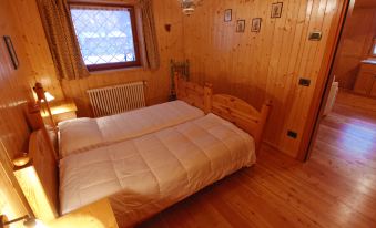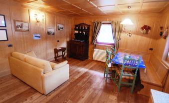 Penia 3 km from Canazei: Child friendly, comfortable chalet "Cesa Galadriel", 1'555 m a.s.l., 2 storeys. 3 apartments in the property. In the hamlet Penia, 1.5 km from the centre of Alba, 3.5 km from the centre of Canazei, in a quiet position, 1 km from the skiing area, south-west facing position. In the house: central heating system, heating available only from 01.Dec. - 01.May.. Parking (limited number of spaces) on the premises, public parking 500 m on the road. Shop 300 m, grocery 100 m, restaurant, bus stop 100 m. Mountain railway 1 km. Please note: car recommended. In case of good snow conditions, the house is accessible on skis. 2-room apartment 50 m2, on the lower ground floor. Beautiful and wooden furniture furnishings: living/sleeping room with 1 double sofabed (140 cm, length 200 cm), dining table and satellite TV (flat screen). 1 room with 2 beds. Large kitchenette (4 hot plates, oven, dishwasher). Shower/bidet/WC. Facilities: washing machine. Internet (WiFi, free). Parking (1 car). Please note: maximum 1 pet/ dog allowed. Fire extinguisher. IT022039B4MA9453LE