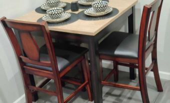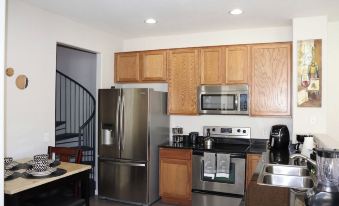 • Eat in Kitchen with stainless steel appliances refrigerator, microwave and dishwasher, utensils, spices, pots and dishware with a table for 4 guests