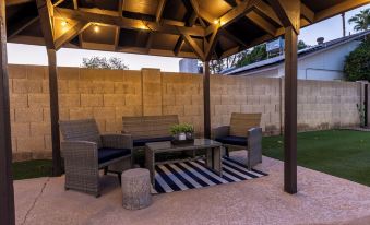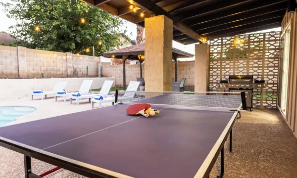 Step outside and be greeted by your own backyard paradise! The large private pool is perfect for a refreshing dip, and a 7-hole putt-putt course will provide endless fun for guests of all ages. Challenge your friends to a match of ping pong, or relax in the shaded pavilion with lounge chairs and a grill, ideal for a BBQ on warm Phoenix evenings. The turfed backyard offers plenty of space for lawn games like corn hole, providing entertainment for everyone in your group.