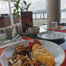 我預訂了三樓的海景房,沒有電梯。景色不錯,但房間比較舊。床好像被蟲咬了。我平常哪裡都不癢,但這裡癢了。玻璃門隔音效果不太好。浴室門被半堵著,洗完澡後地板都濕了。早餐不太好吃,但對其他人來說可能還不錯。總的來說,早餐不錯,但我不會再來了。 Samut Bar 的景色我得給加分。
