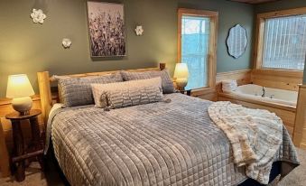 The master bedroom features a King bed, 32" flat screen TV, Jetted Tub and full bathroom with shower.