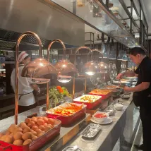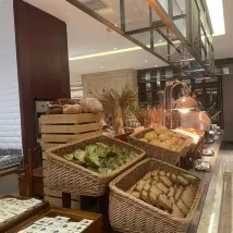 首先房間質感滿分, 木質調裝修高級又温馨,空間寬敞通透,大窗户能俯瞰城市景色,辦公區和休息區的分區設計也很貼心,住起來既舒適又方便。 早餐更是驚喜,餐食種類豐富還新鮮——湯粉鮮爽入味,沙拉、點心和水果搭配得很均衡,味道和品相都在線,吃完一上午都很滿足~ 整體不管是硬件設施還是餐飲細節,都能感受到用心,是會想再來的酒店!