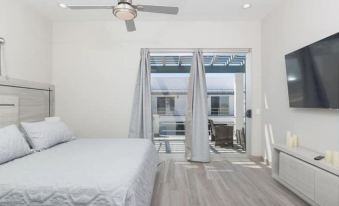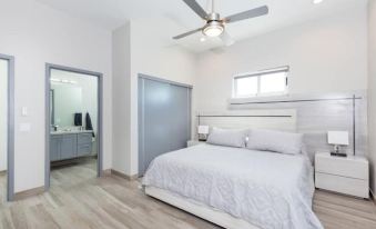 Master bedroom: 1 king size bed, 75 inch TV, and a private bathroom.
