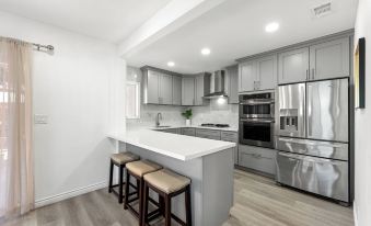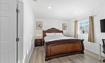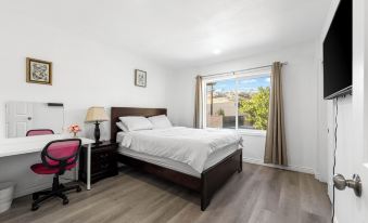 Relax in this updated 4-bedroom, 3-bathroom home in central Pomona—just minutes from Highway 10. Perfect for families or business travelers, it features two en-suite bedrooms, smart TVs in every room, a fully equipped kitchen, and cozy shared spaces.