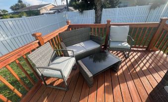 Our 2 bedroom/1 bathroom house features two patio areas and a cozy fire pit area. It has a master bedroom with a king bed and a big screen TV. Plenty of closet space. The guest room has 2 twin plus beds and a flat screen TV as well. The living room has a pull-out queen sofa bed and a big screen TV. Separate dining room area. The kitchen features stainless steel appliances and quartz countertops. It comes fully equipped make cooking and eating at home convenient.