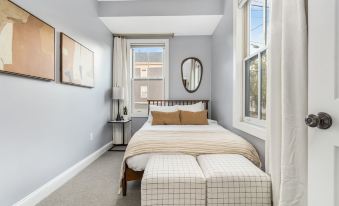 Situated above a beloved neighborhood tavern, this urban apartment has been fully remodeled and professionally designed with beautiful furnishings and fixtures. The living room is spacious with plenty of seating and an extra comfy couch to lounge on along with a work desk and chair.