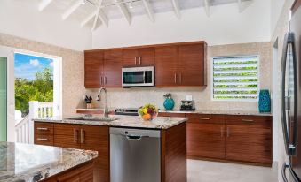 The Great Room is open and airy with soaring 18’ cathedral ceilings, sofa seating area, 60” flat screen smart TV, a dining table that seats 12, and writing desk. Original island paintings by a local artist adorn the walls throughout the villa. The gourmet kitchen features all stainless steel appliances, granite counters, mahogany cabinets, and comes fully stocked with professional-grade cookware and accessories. The outdoor kitchen area features a gas BBQ grill, an ice maker, a beverage fridge, and granite counters.