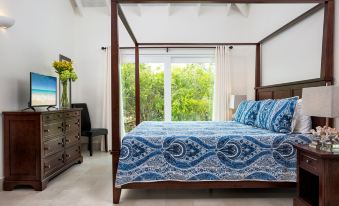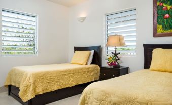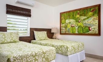 • Coconut Palm Suite: 2 twin beds or one king bed with an en suite bath featuring stone counters, double sinks and tiled shower. First floor.