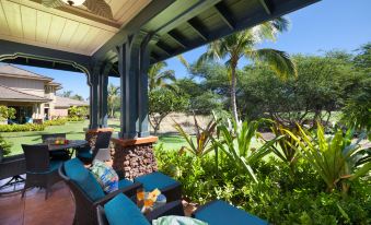 Lanai: Overlooks the lush green of the Mauna Lani South Golf Course's 6th hole, featuring comfortable seating and a private gas BBQ grill with an outdoor kitchen for gourmet meals.