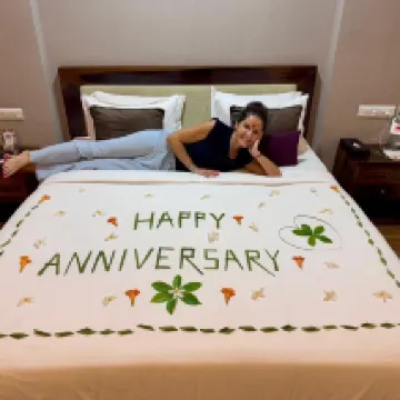 Vriendelijk personeel, Anil had een mooie creatie gemaakt op ons bed voor ons 35 jarig huwelijk! Het eten is ook erg lekke, allemaal vegetarisch . Heerlijke grote, lichte kamer met lekker bed. Absoluut een aanrader!!