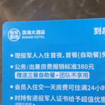 中秋節和家人到泉州玩,入住濱海大酒店,上來就給了升房驚喜。房間乾淨清爽安靜,服務人員温暖親切,前台保潔大廳服務員無論誰都笑盈盈地打招呼,態度真誠友好。早餐夜宵品種豐富,食材新鮮,地方特色飲食尤其美味,每天都有水果和不限量瓶裝水,提供各種小物品,細節暖心,慶幸自己選對了寶藏酒店!更令人敬佩的是濱海大酒店是崇軍擁軍先進單位,軍人入住有驚喜,全力支持,全力推薦!